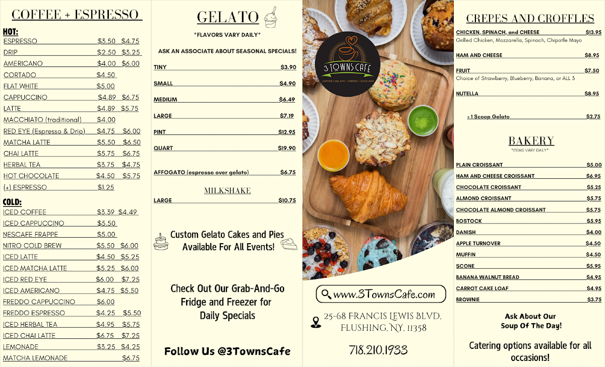 Whether you're craving a cozy cup of coffee, a healthful juice shot, or a creamy scoop of gelato, 3 Towns Cafe Juice Bar & Gelato is your go-to spot in Flushing. Make sure to stop by and enjoy the incredible flavors and unbeatable hospitality. Your next favorite treat is just a visit away!
