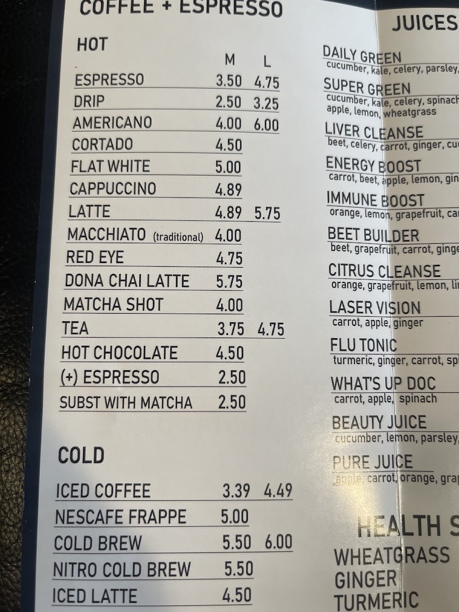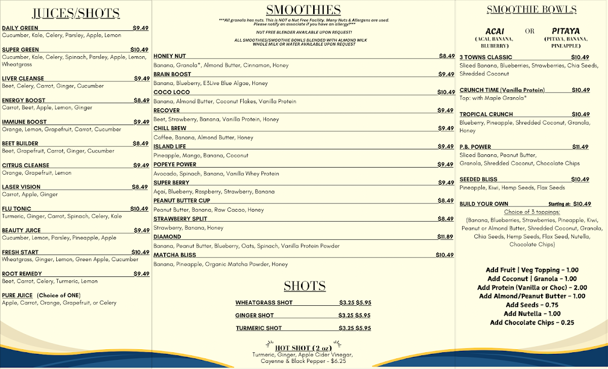 At 3 Towns, the menu offers a splendid selection that caters to diverse cravings. From refreshing health shots like the Ginger, Turmeric, and Wheatgrass at just US$3.25, to the invigorating Hot Shot featuring a vibrant blend of ginger, turmeric, apple cider vinegar, and more for only US$6.25, you'll find an array of options designed to boost your day.